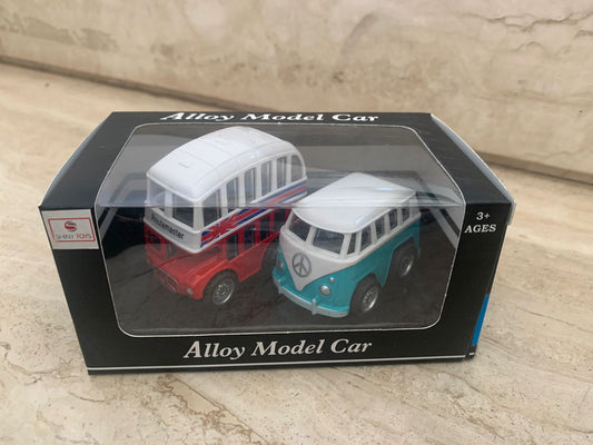 Conjunto de 2 Carrinhos de Fricção em Metal - Ônibus Turismo e Kombi