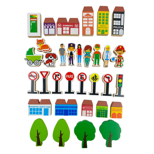 Conjunto Carrinhos e Placas de Trânsito de Madeira