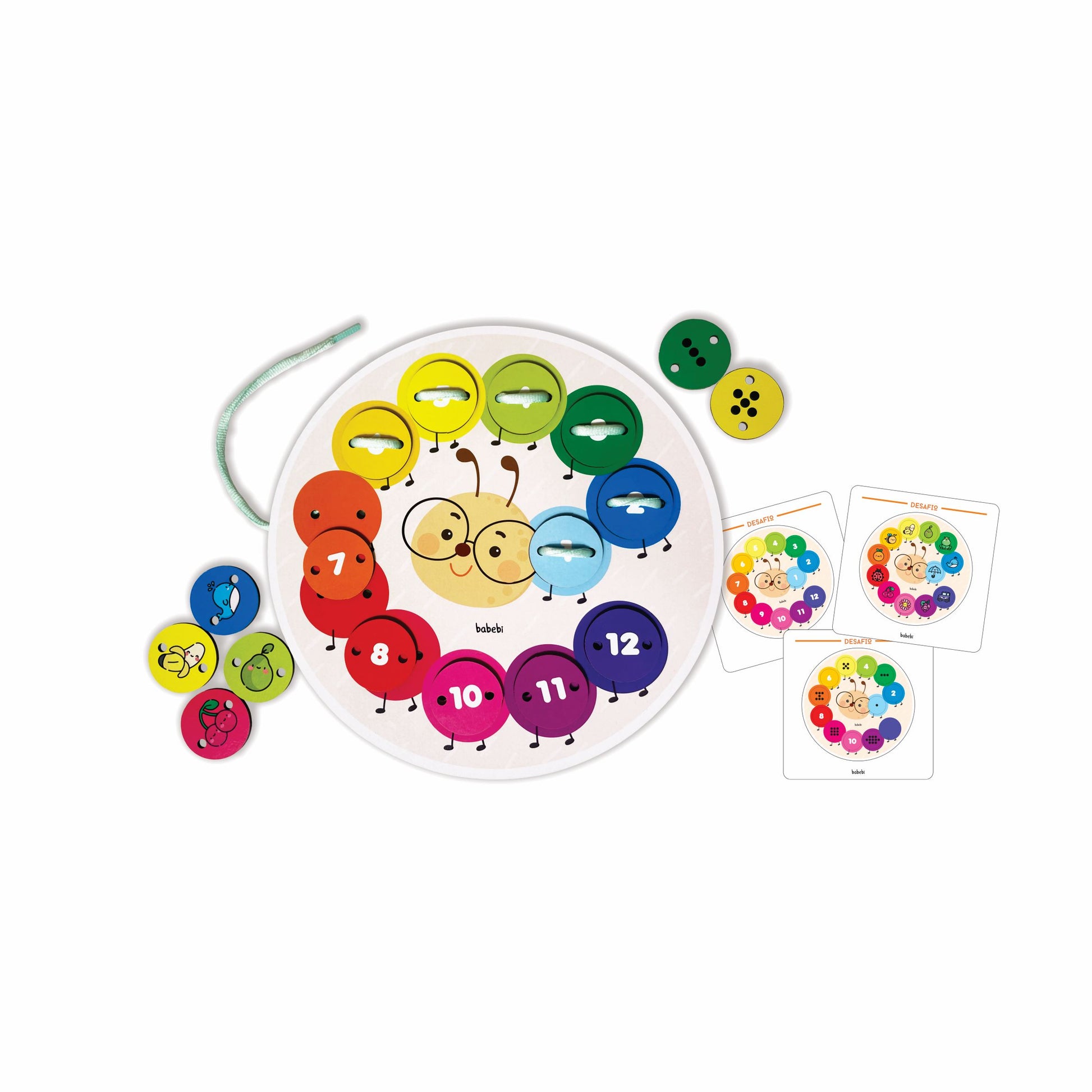 Composição: 1 tabuleiro, 48 peças entre números, quantidades, cores e figuras, 1 cadarço e 12 fichas de desafios. Feito de madeira MDF reflorestada.