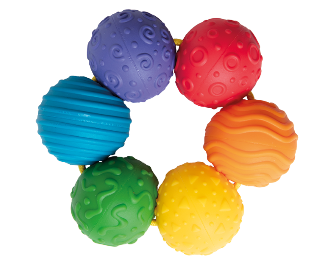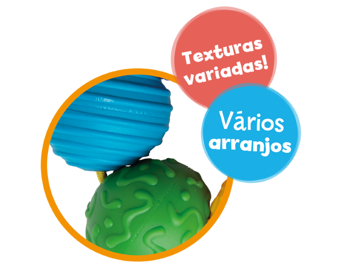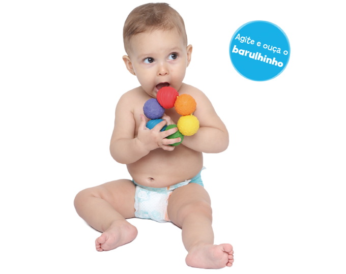 Mordedor em formato de argola com seis bolinhas coloridas e texturizadas. São fáceis de segurar e gostosas de morder!