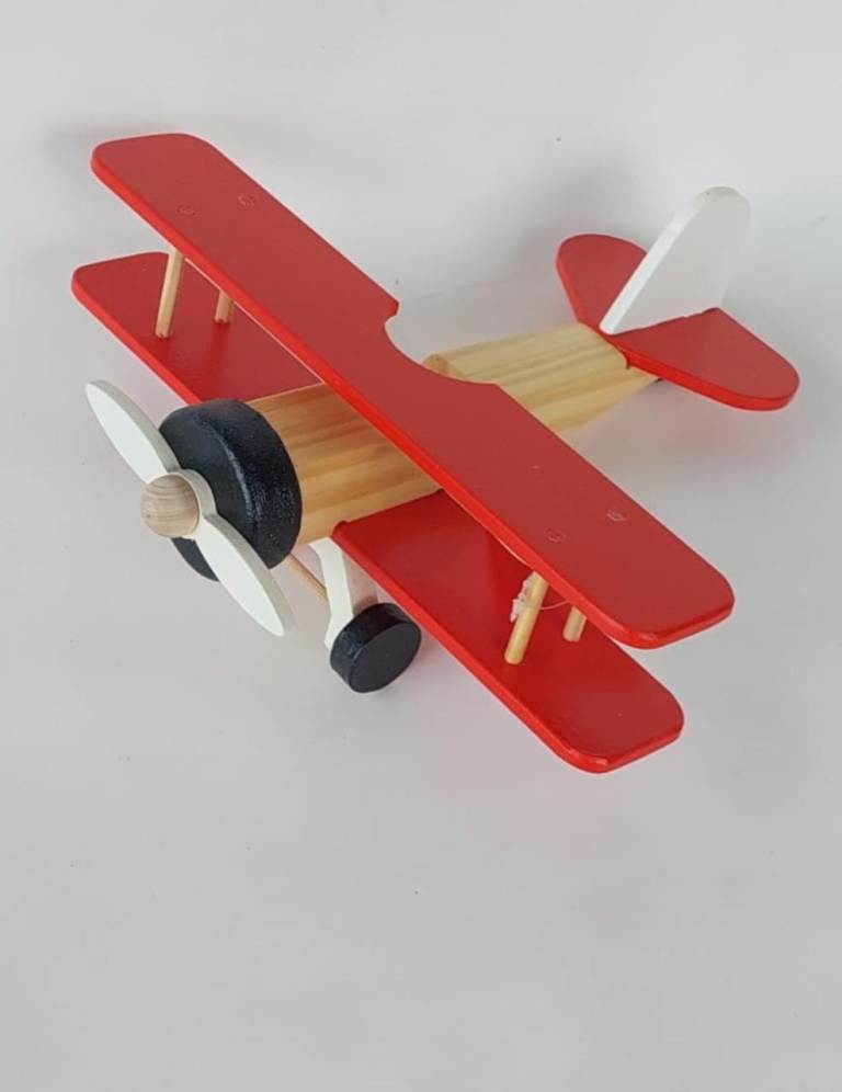 Composição: Avião bi-plano com hélice móvel pintada em 3 cores. Fabricado com madeira maciça pinus.