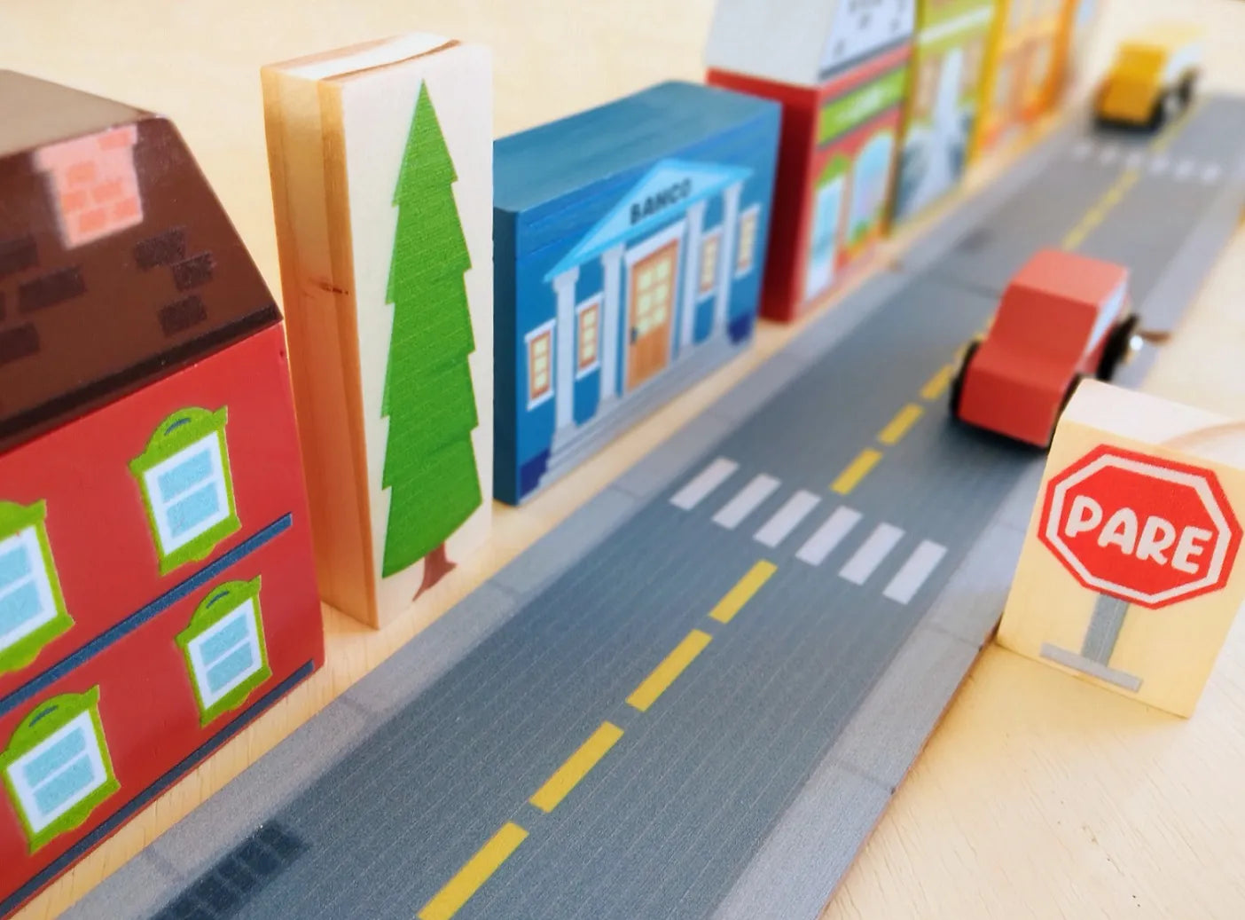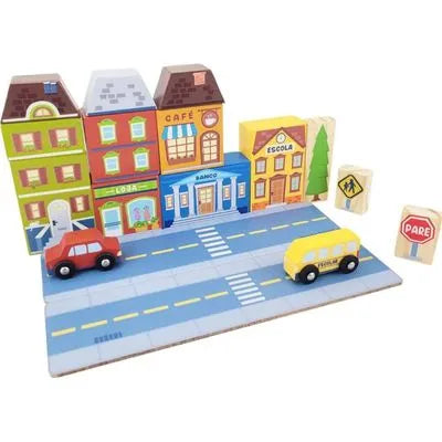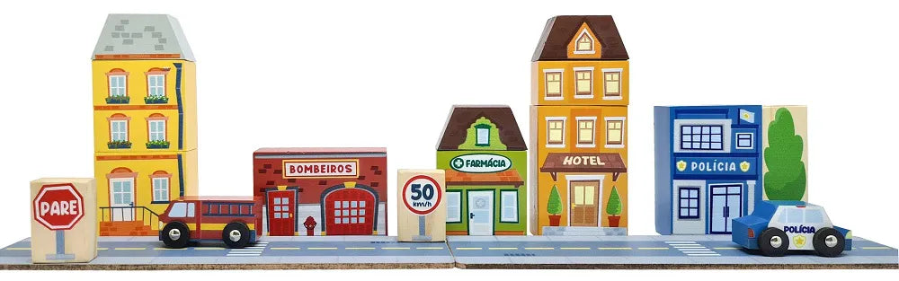 Composição: 17 blocos sortidos: 2 placas de pista, 2 placas de trânsito, 2 carros, 1 prédio de apartamentos (com 3 peças), 1 corpo de bombeiros, 1 hotel (com 3 peças), 1 farmácia, 1 árvore, 1 delegacia. Peso: 740g. Material: Madeira reflorestada pinus e tinta atóxica. Dimensões do produto: 27 x 3,5 x 15 (comp x larg x alt)