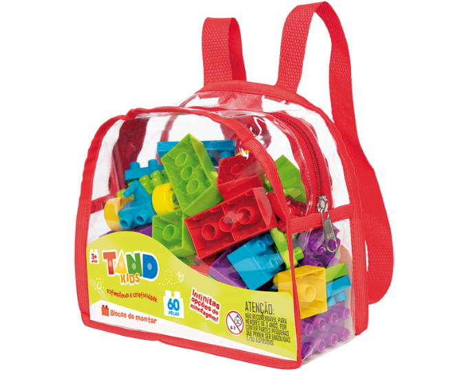 Uma mochila para a criança levar aonde quiser com todos os 60 blocos de montar de Tand kids para se divertir com elas!