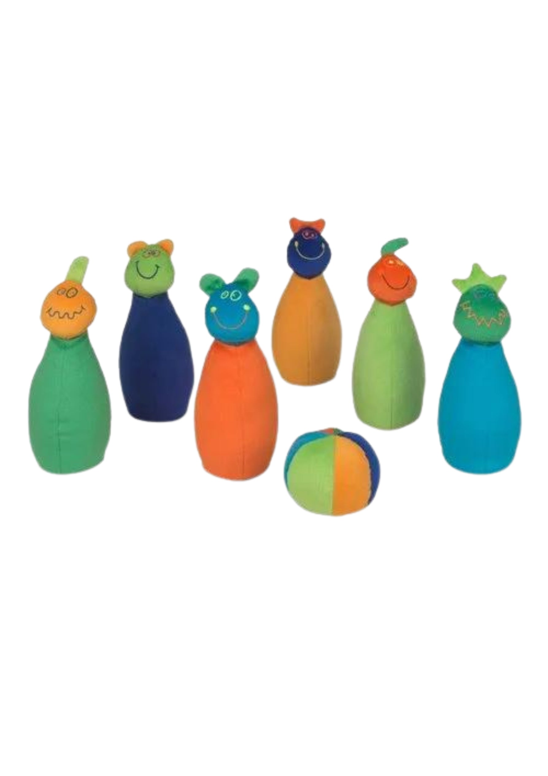 Composição: s 6 pinos com 9x24x6 cada e 1 bola com diƒmetro 10 cm. Material antialérgico (plush 80% algodão e 20% poliéster) e fibra proveniente de reciclagem de garrafa PET (100% poliéster).