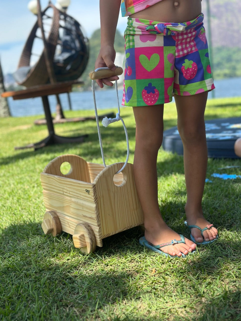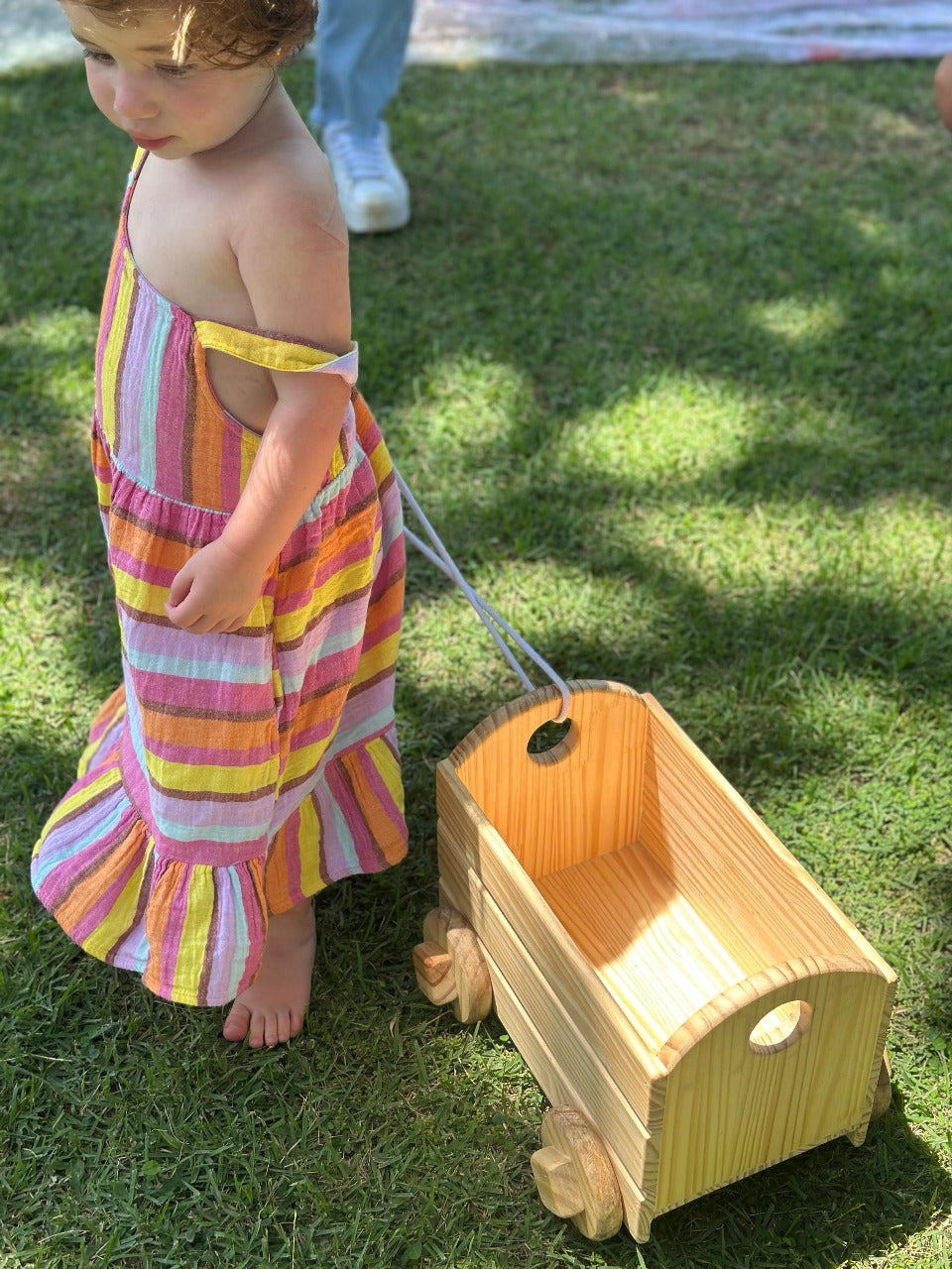 Composição: Produzido em madeira pinus de reflorestamento, com acabamento que permite higienização e limpeza. Medidas do Produto C 34 cm x L 20 cm x A 26cm - Peso 1,250kg. Tem rodas, eixo e o caixote em madeira. Suporta até 3kg!