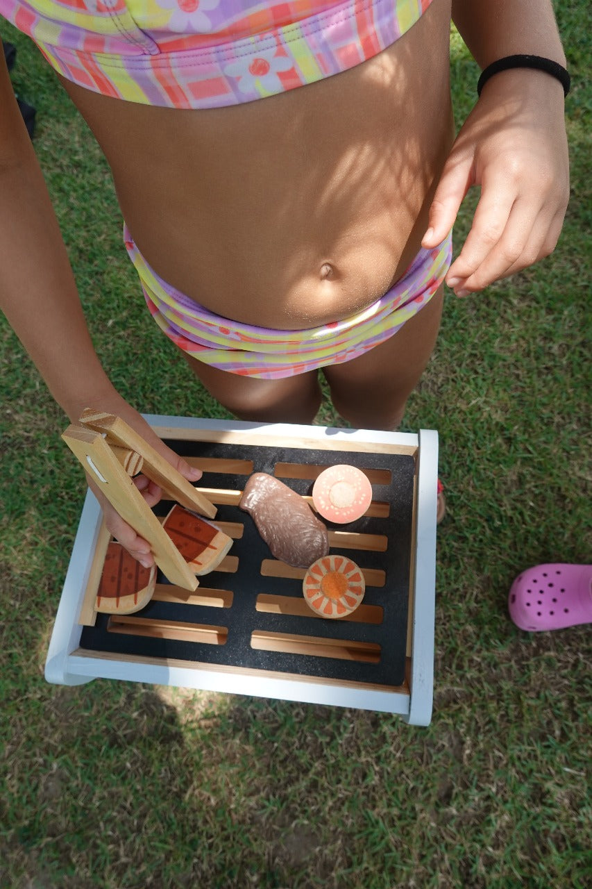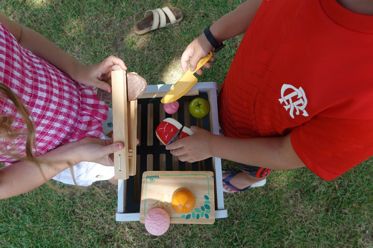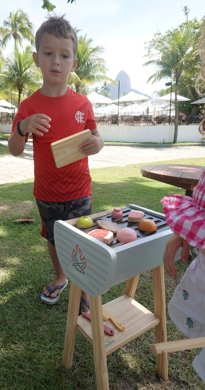 Composição: 1 Churrasqueira, 1 pinça de madeira, 1 tábua, 1 faca, 3 alimentos com corte. Total 10 peças; Dimensões do produto com embalagem: 56 x 33 x 26,5 cm; Material: Madeira reflorestada e tinta atóxica.