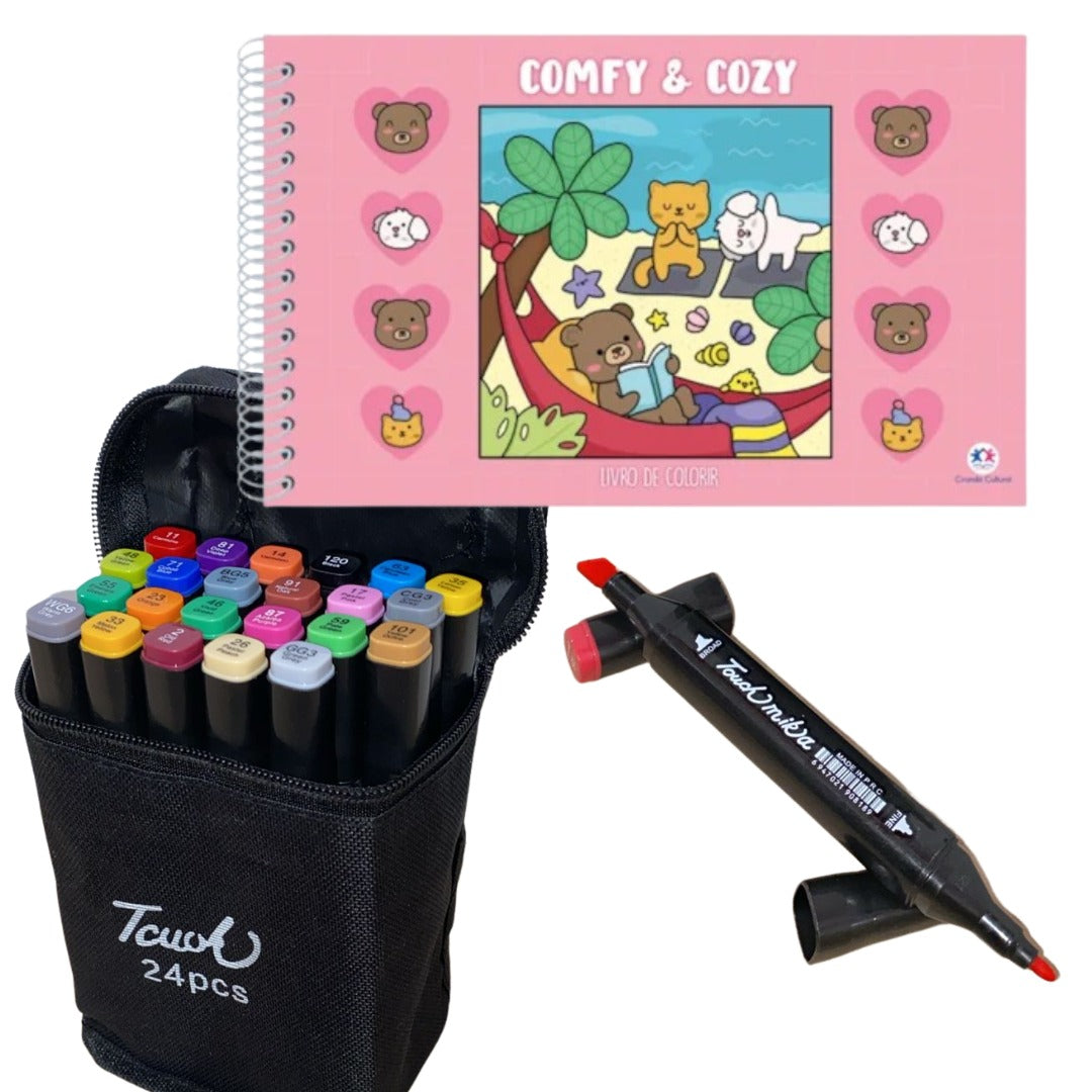 O livro de colorir + canetinhas de 24 cores é uma excelente escolha para quem busca transformar pequenos momentos em experiências de relaxamento e conforto.