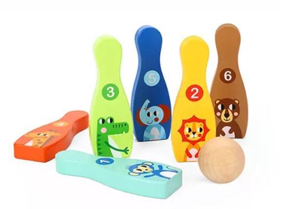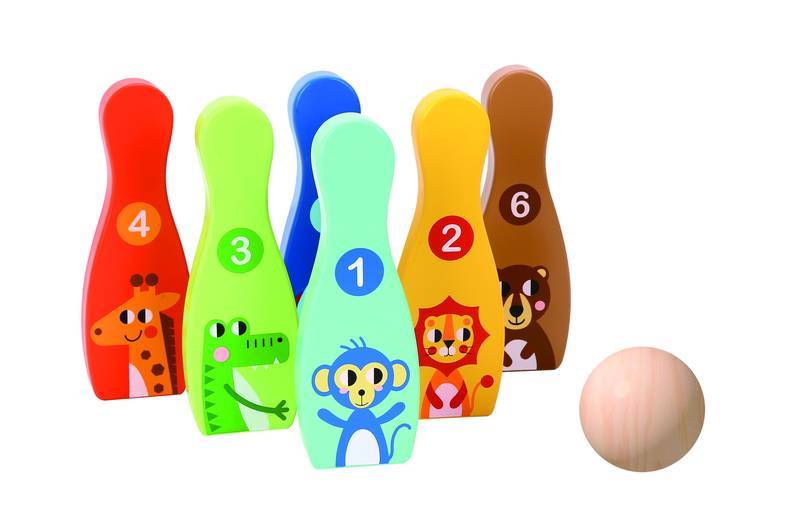 Divirta-se dentro ou fora de casa com o jogo de boliche de madeira da Tooky Toy! Derrubar todos os pinos "animais" com o menor número de jogadas possível, derrubá-los todos de uma vez?