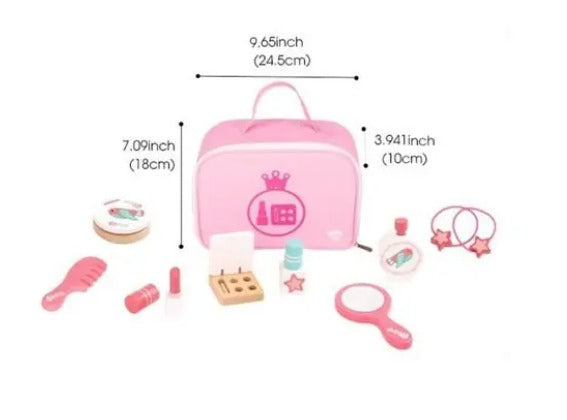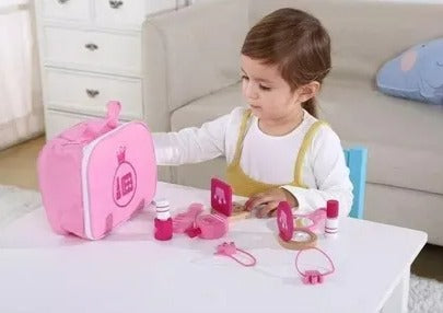 Que tal uma maletinha cheia de maquiagens e utensílios de beleza pra levar pra onde quiser! Usando a imaginação, as crianças vão se divertir com os itens dessa maleta, brincando sozinhas, com amigos ou mesmo produzindo um familiar! Tem tudo que a bolsa da mamãe tem, pente, espelho, elásticos, batom, caixinha de sombra, caixinha de blush, vidrinho de esmalte e vidrinho de perfurme.