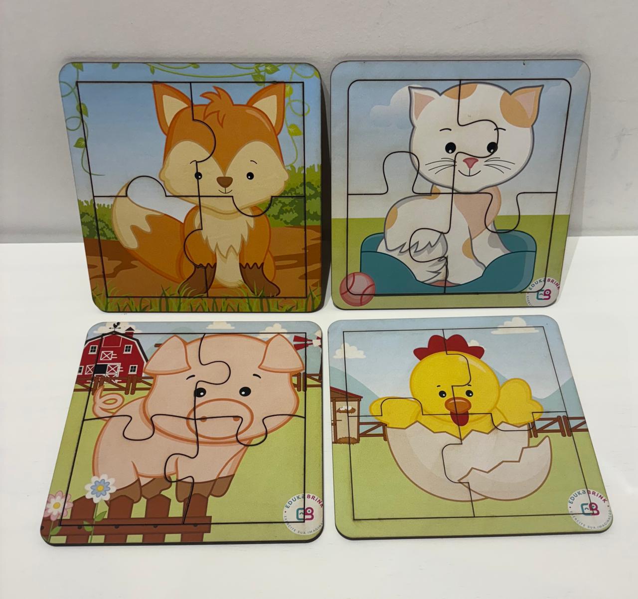 Kit de 4 Quebra-cabeças educativo com desenho de animais de fazenda, com 4 peças e a base para montar. Brinquedo confeccionado artesanalmente em madeira de reflorestamento.
