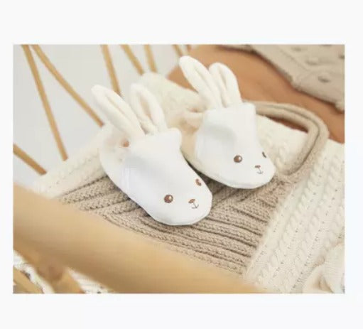 As orelhas grandes e macias são fáceis para o bebê segurar e podem ser penduradas em qualquer lugar que o bebê vá. Além disso, as orelhas são removíveis para facilitar a lavagem. As pantufas podem ser usadas de 0 a 6 meses e combinam com a naninha e o mordedor para manter o bebê aquecido. Feitas com dois materiais, veludo cotelê e camurça, são macias e fofas nos pés do bebê, com pequenas orelhas de coelho. Este conjunto vem em uma caixa bonita que pode ser personalizada com uma mensagem no espaço sob a tampa. Lave à máquina a 30° para a naninha e o mordedor. Lave à mão as pantufas.