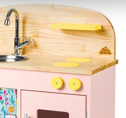 possui pia e fogão em um só brinquedo. Com um charmoso cooktop de