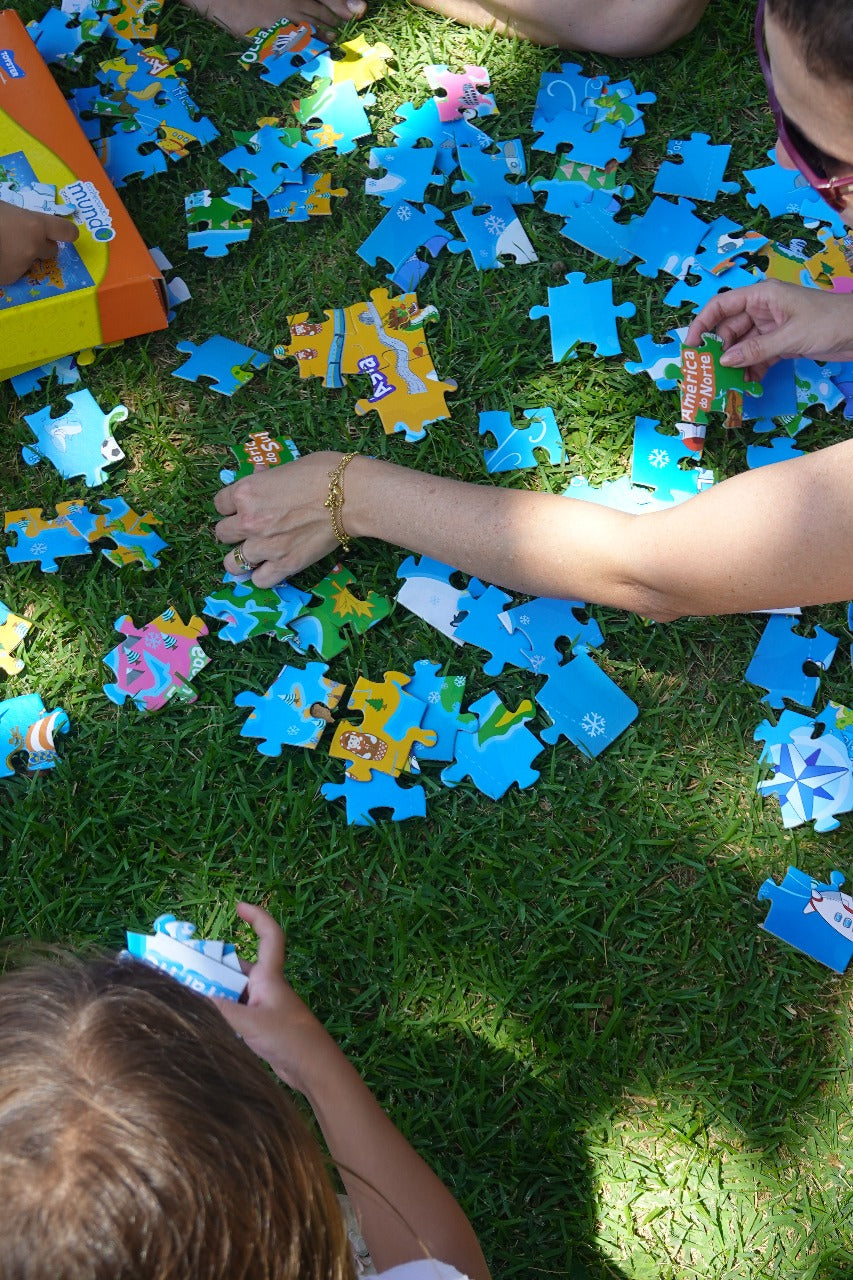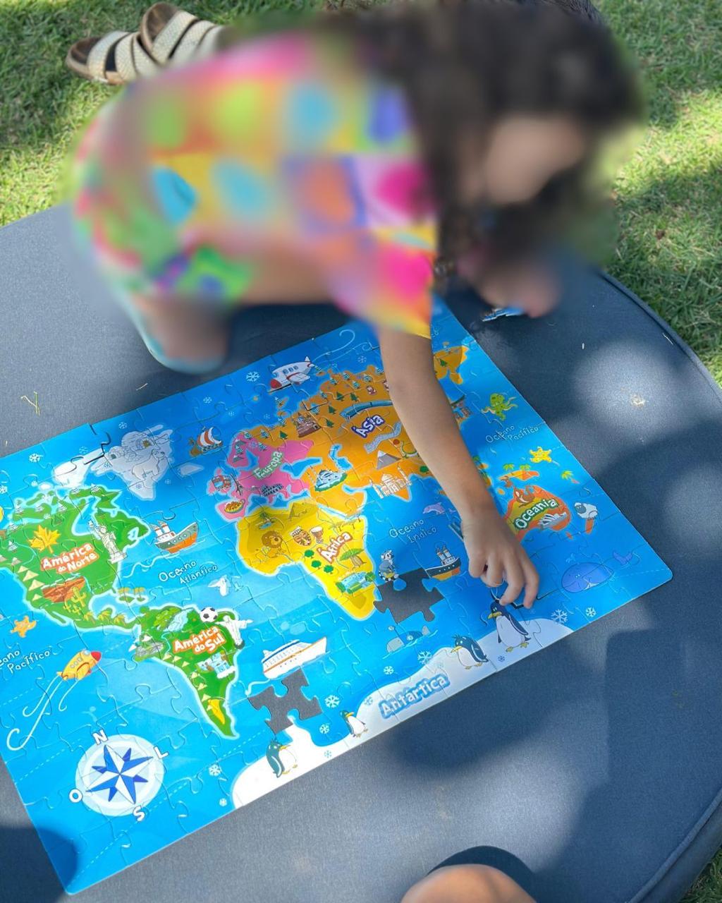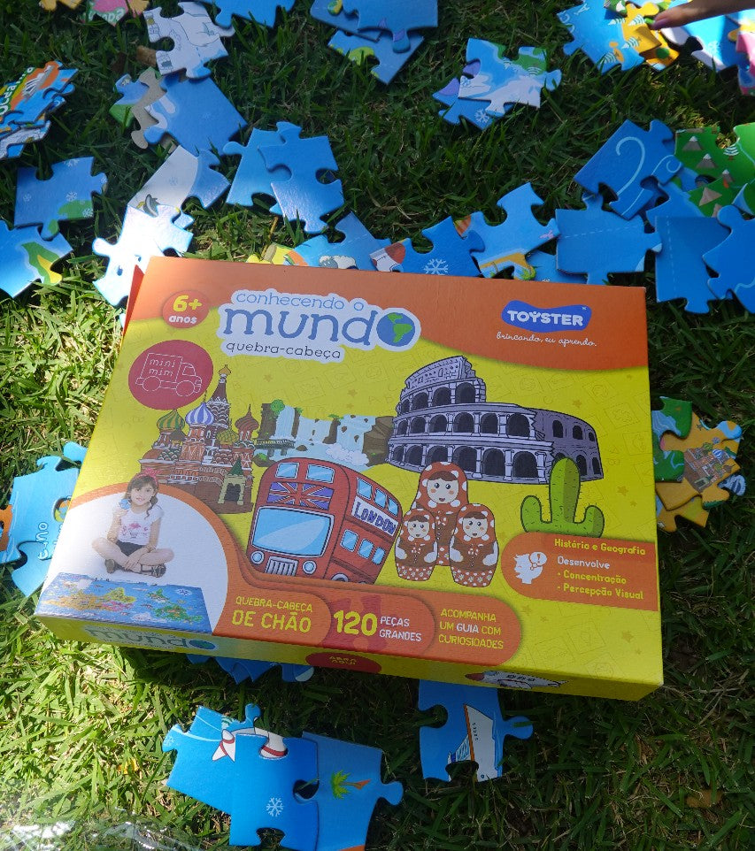 Quebra-cabeça grande de chão. Com elementos da natureza e pontos turísticos, ensina a localização dos continentes para as crianças.