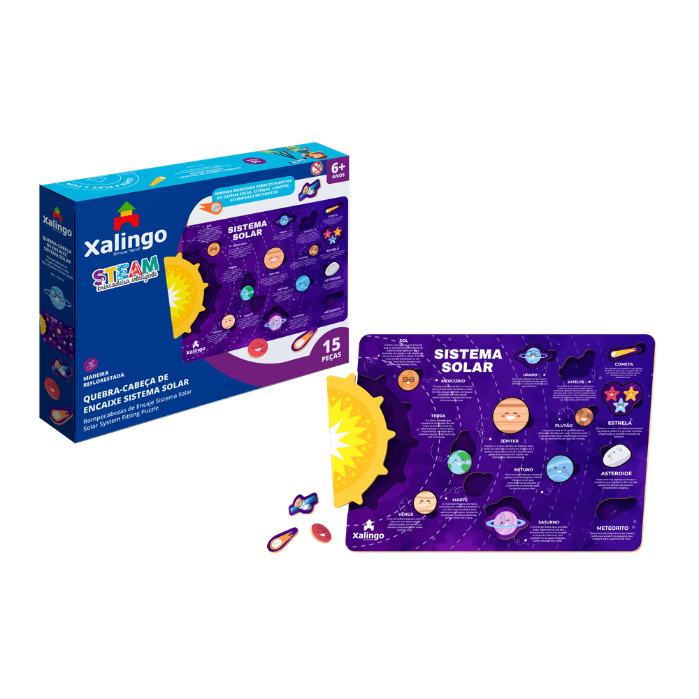 O Steam Quebra-Cabeça Encaixe Sistema Solar, é um jogo educativo, composto por 15 peças em madeira reflorestada, onde permite à criança aprender brincando sobre os planetas do sistema solar, estrelas, cometas, asteróides e meteoritos! Também, é ideal para professores trabalharem o conteúdo nas aulas, auxiliando os pequenos no desenvolvimento da atenção, memória, concentração, coordenação motora, noção espacial e percepção visual, de maneira lúdica e divertida.