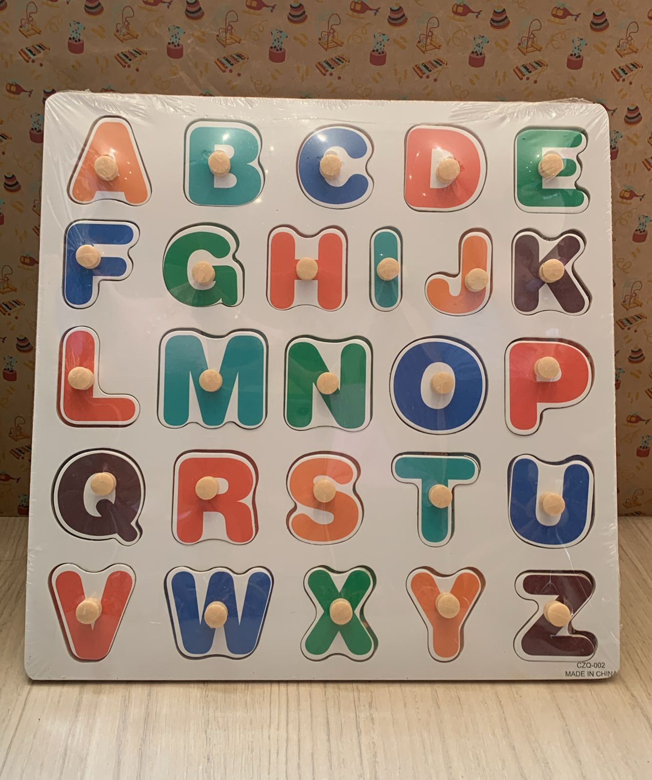 Tabuleiro Educativo de Madeira com Pinos Letras do Alfabeto. Brinquedo de encaixe que desenvolve coordenação motora, raciocínio logico e o primeiro aprendizado do alfabeto.