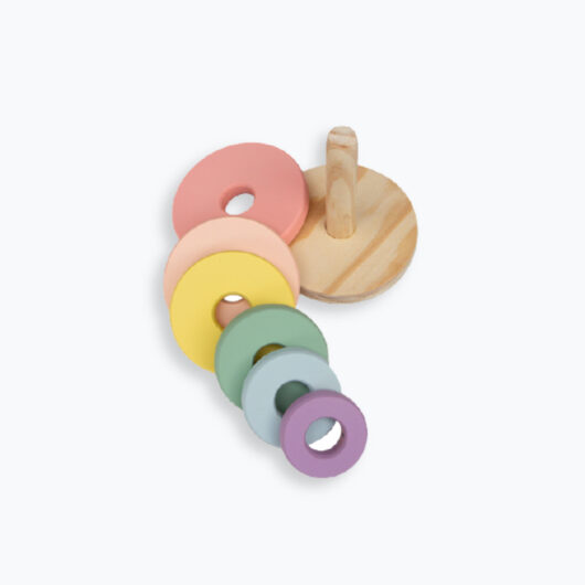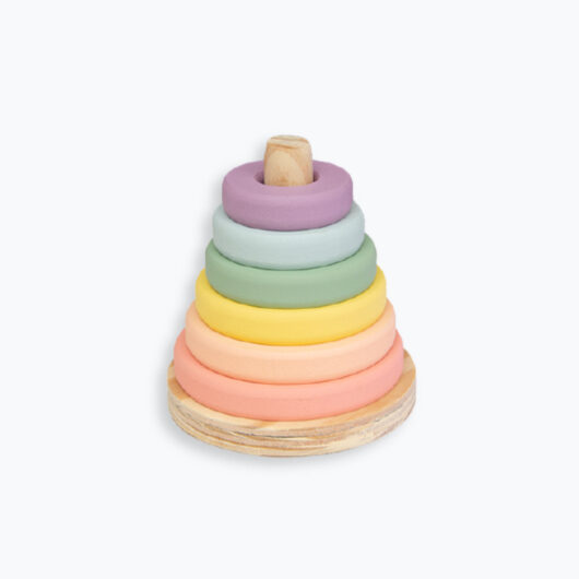 Torre de empilhamento contendo base e seis peças coloridas. Confeccionado artesanalmente em madeira de reflorestamento e pintado com tinta atóxica.