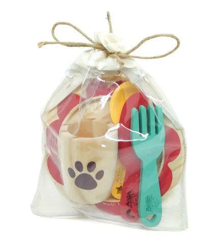 Composição: 5 peças, Prato diâmetro: 14,5 cm x altura 1,5 cm, Copo diâmetro: 4,7 cm x altura 7 cm, Faca, Colher e Garfo: 11,5 x 2,5 x 0,6 cm. Material: Madeira reflorestada.