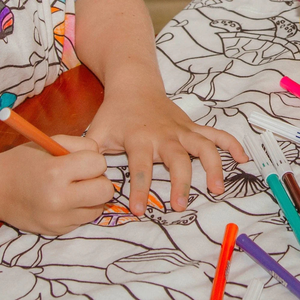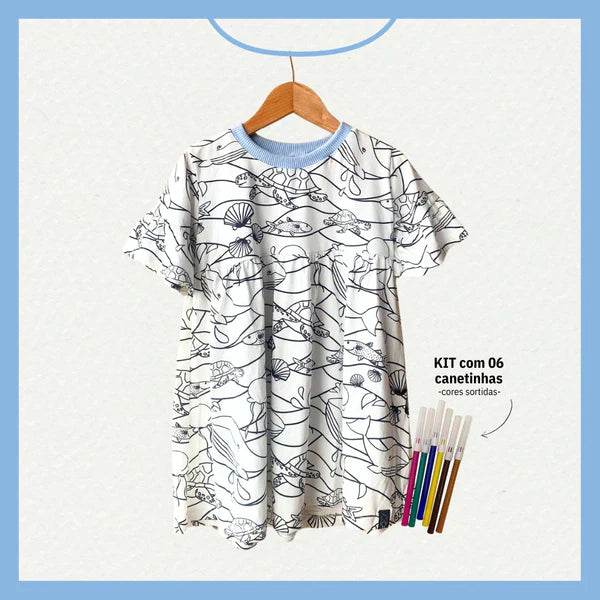 Para pintar, brincar e lavar! Vestido curto, amplo, com saia rodada e detalhe babado nas mangas curtas, produzido com estampa exclusiva Um Mergulho na Ilha em tecido 100% algodão e golinha colorida em ribana azul. Acompanha estojo com 6 canetinhas hidrocor laváveis e atóxicas.