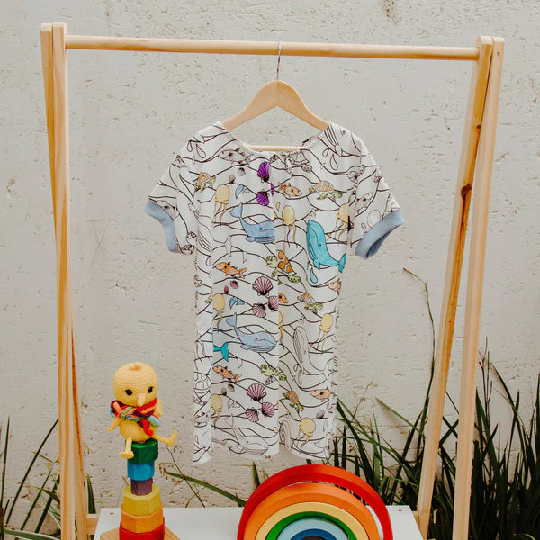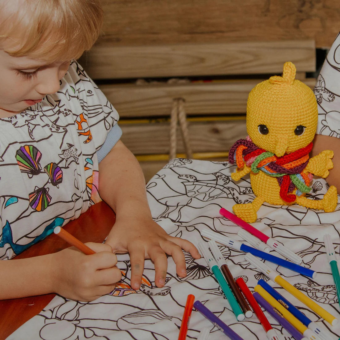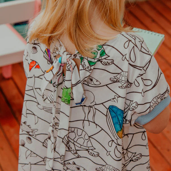 Para pintar, brincar e lavar! Vestido curto, soltinho, com detalhe franzido na gola e amarração laço nas costas, produzido com estampa exclusiva Um Mergulho na Ilha em tecido 100% algodão e com detalhe nas mangas em ribana azul. Acompanha estojo com 6 canetinhas hidrocor laváveis e atóxicas.